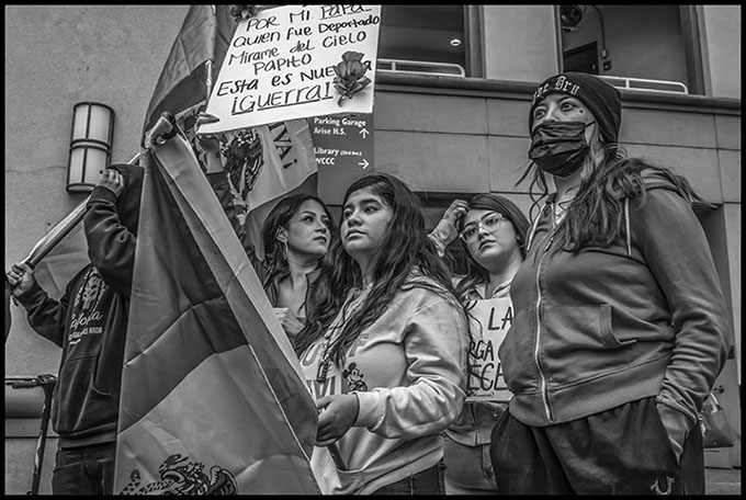 OAKLAND, CA – 10JUNE25 – Community and immigrant rights organizations rally in the Lationo Fruitvale district to protest immigration raids and the use of the National Guard in Los Angeles. Copyright David Bacon