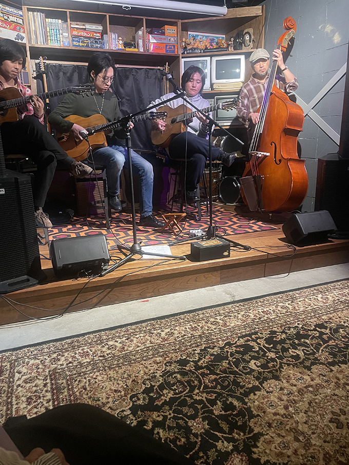 At the Sometime session we were fortunate to meet and interacted with a young American named Adam Smith who has been living in Tokyo for 12 years and is a practitioner of “Gypsy Jazz”. “Gypsy Jazz” refers to an acoustic guitar, often called a Selmer-Maccaferri guitar, designed for increased volume and the punchy swing sound popularized by Django Reinhardt – himself a Romani gypsy native of Belgium. On March 15th we went to hear Adam and his cohort of Gypsy jazz musicians at The Den, a music club in Koenji.